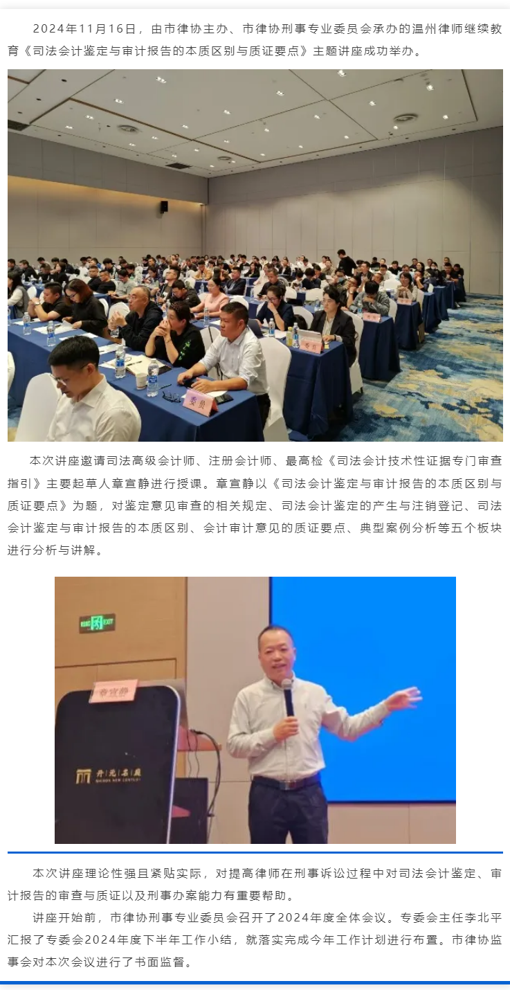 市律协成功举办继续教育第三十一讲《司法会计鉴定与审计报告的本质区别与质证要点》主题讲座暨市律协刑事专业委员会工作会议