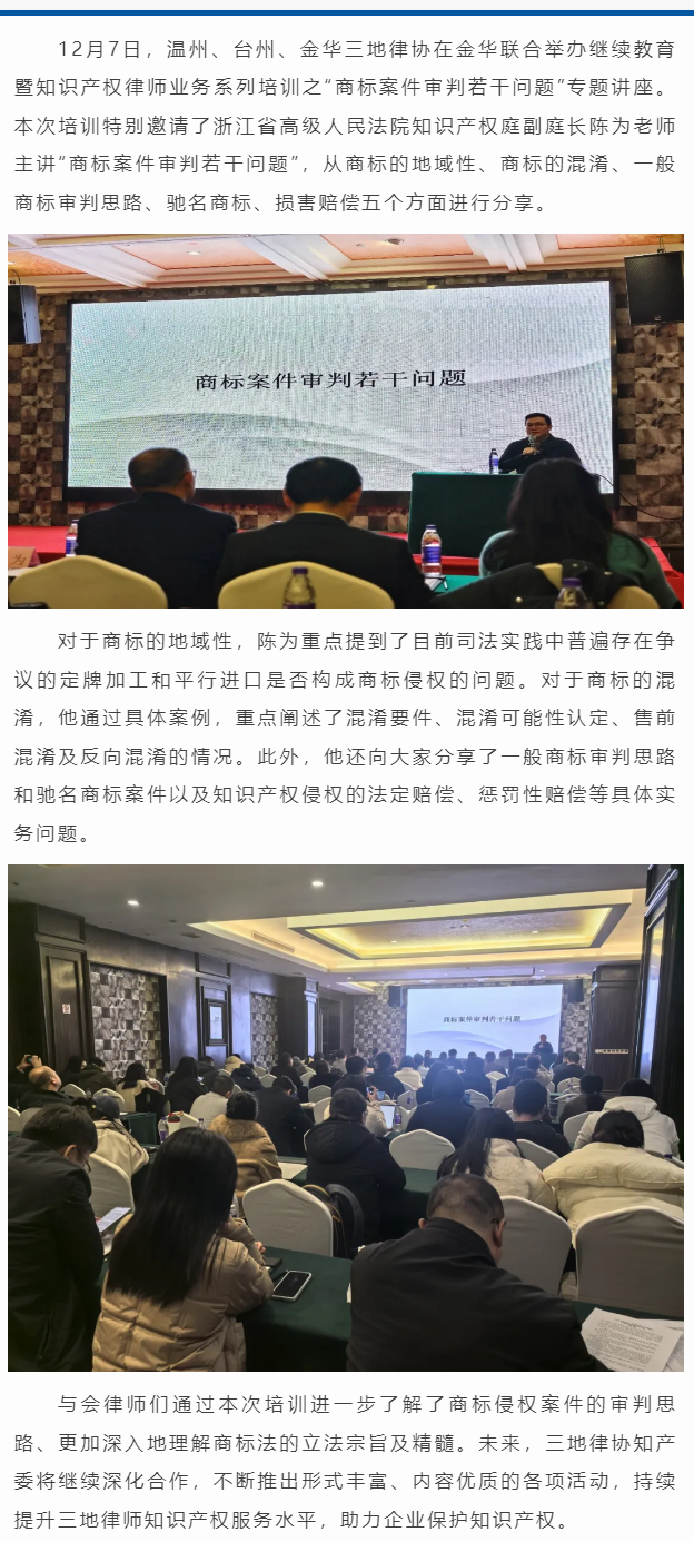 温州、台州、金华三地律协联合举办继续教育暨知识产权律师业务系列培训之“商标案件审判若干问题”专题讲座