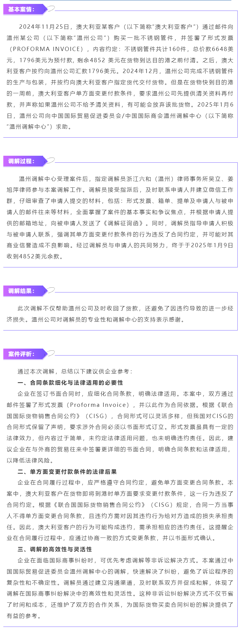 外方改付条件,调解敦促履约——我市律师成功调解一起国际货物买卖合同纠纷