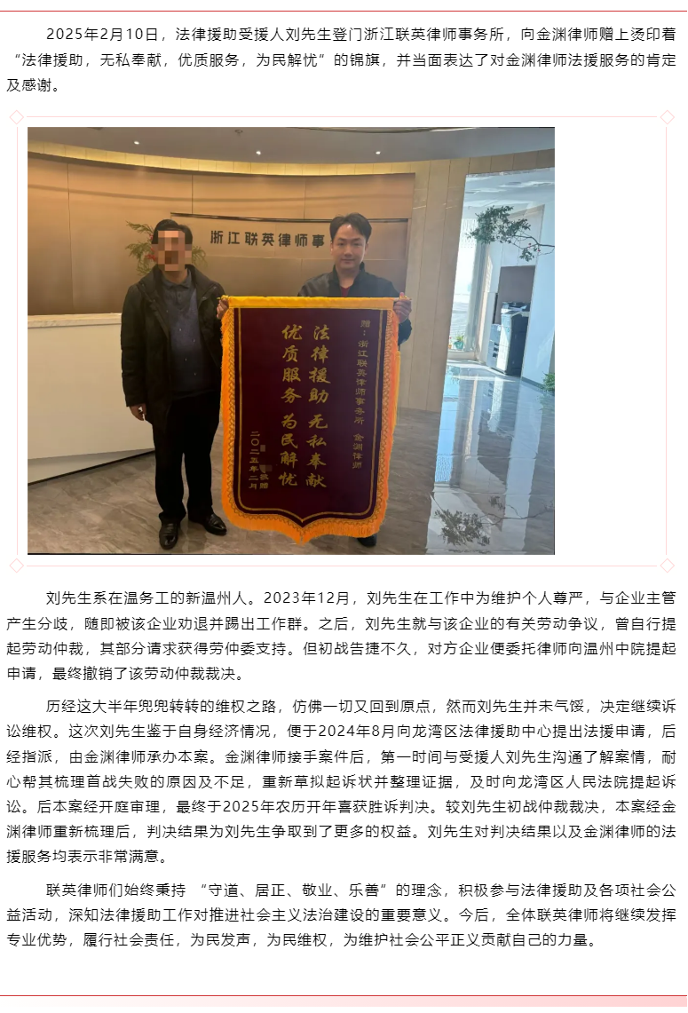 “无私法援 优质服务”——联英所金渊律师获当事人赠锦旗