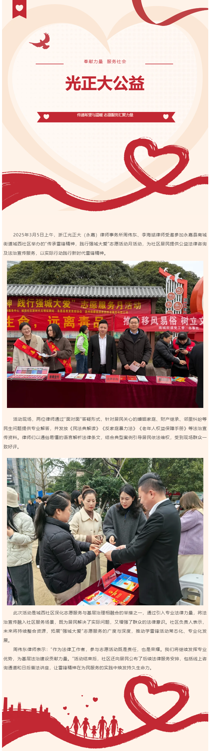 光正大(永嘉)所律师受邀参加南城街道城西社区 “传承雷锋精神,践行强城大爱”志愿活动月活动