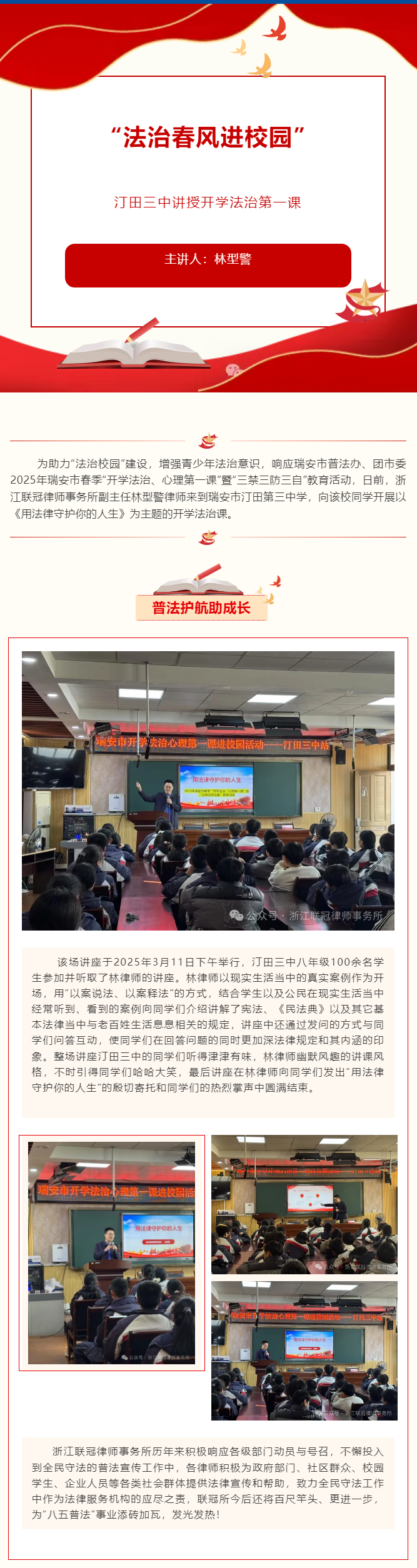 “法治春风进校园”——联冠所林型警律师为汀田三中讲授开学法治第一课