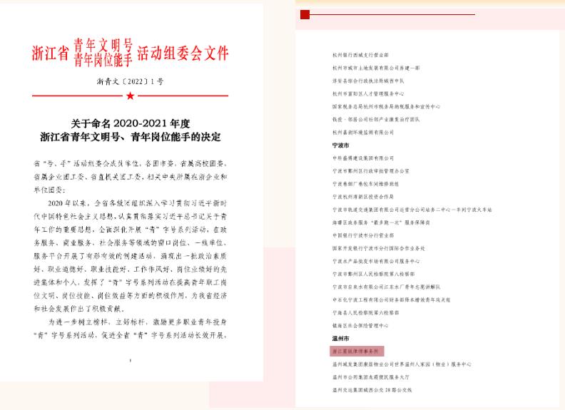 近日,2020—2021年度浙江省级青年文明号、青年岗位能手名单发布,浙江震瓯律师事务所荣获“浙江省青年文明号”称号。