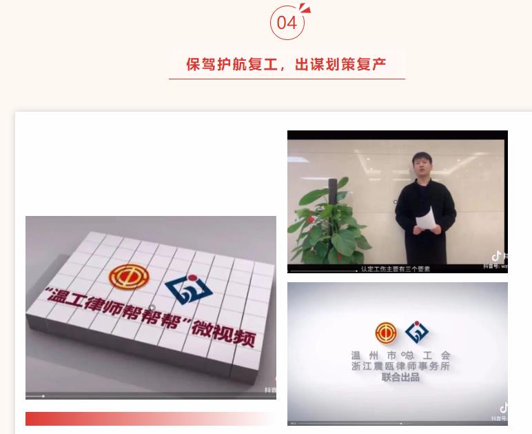在抗疫特殊时期,充分利用网络媒介,多措并举开展法制宣传和法律服务。震瓯所青年律师与温州劳动总工会合作拍摄《符合复工规定条件的复工企业,劳动者不愿复工应如何管理?这里给你答案!》、《疫情防控期间企业能否随意解除职工劳动合同?这里给你答案!》等8组复工复产普法视频,将企业以及民众在疫情防控期间可能面临的主要法律风险以知识点口述形式,拍摄成时下流行的短视频进行普法宣传。