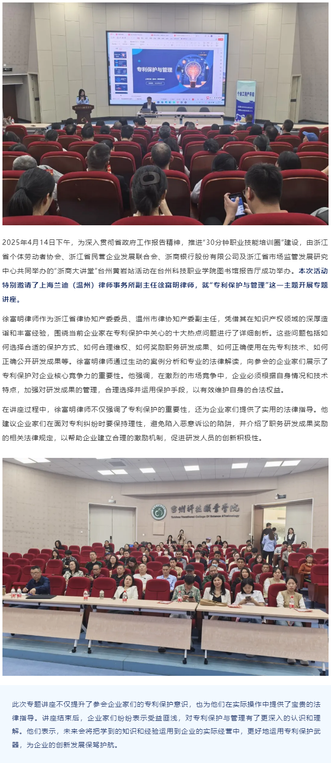 兰迪温州所徐富明律师应邀参加“浙商大讲堂”活动,开展“专利保护与管理”专题讲座