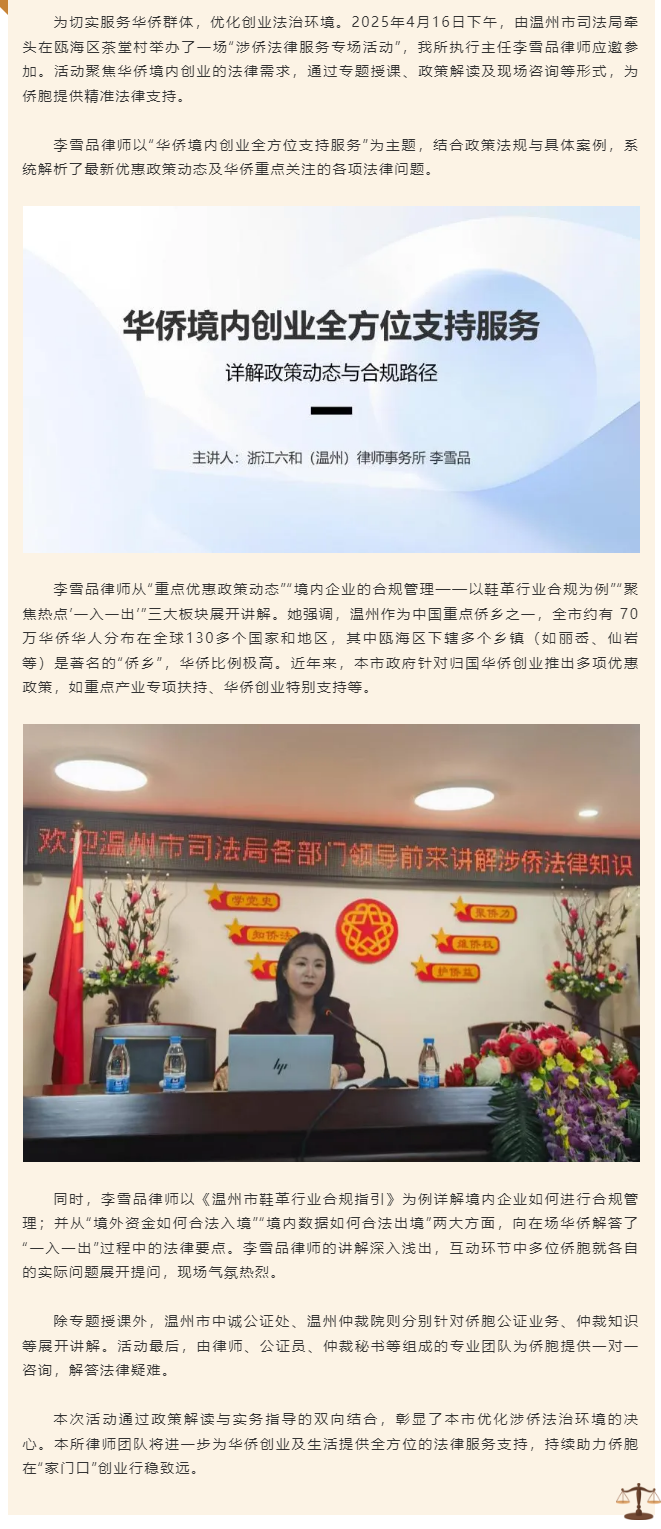 六和温州所李雪品律师应邀参加涉侨法律服务活动并开展主题授课