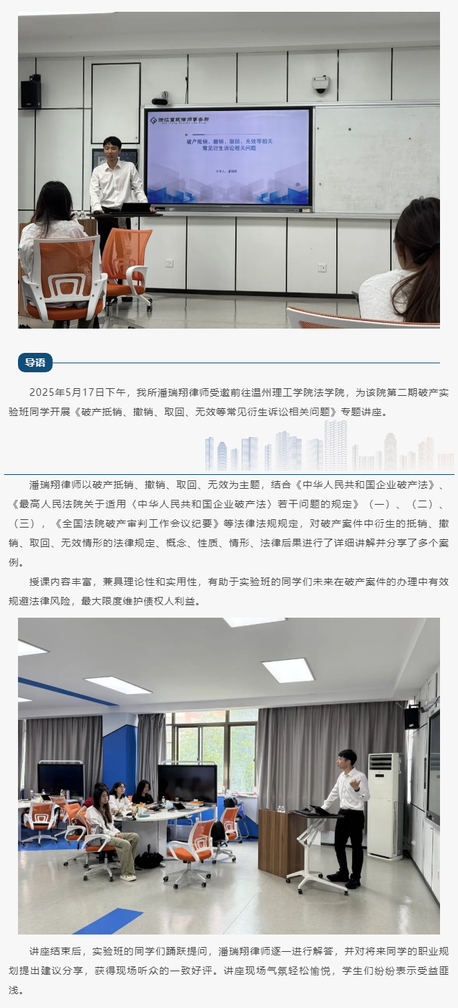 震瓯所潘瑞翔律师受邀为温州理工学院法学院第二期破产实验班开展破产衍生诉讼专题讲座