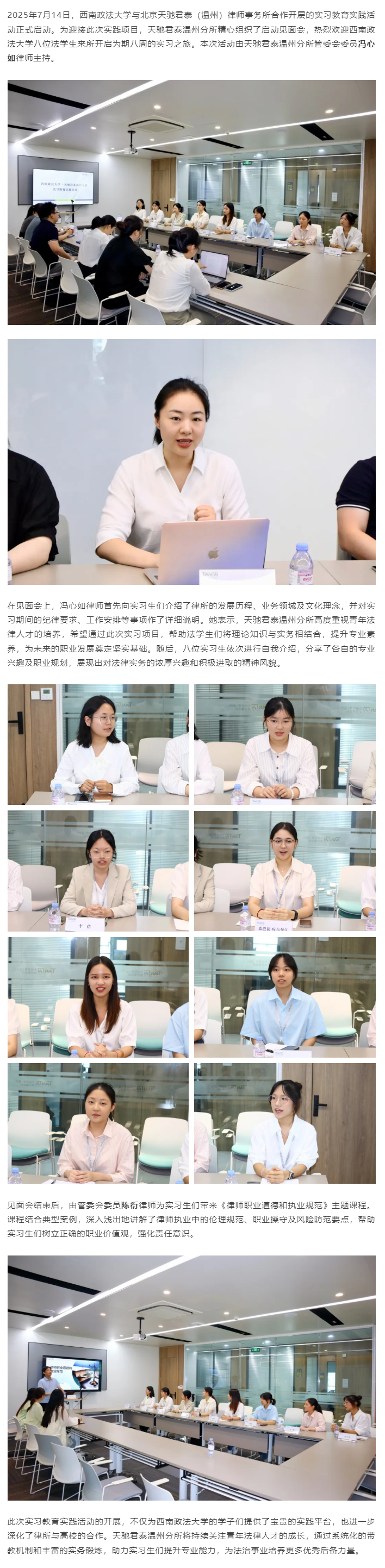 西南政法大学与天驰君泰温州分所实习教育实践活动正式启动