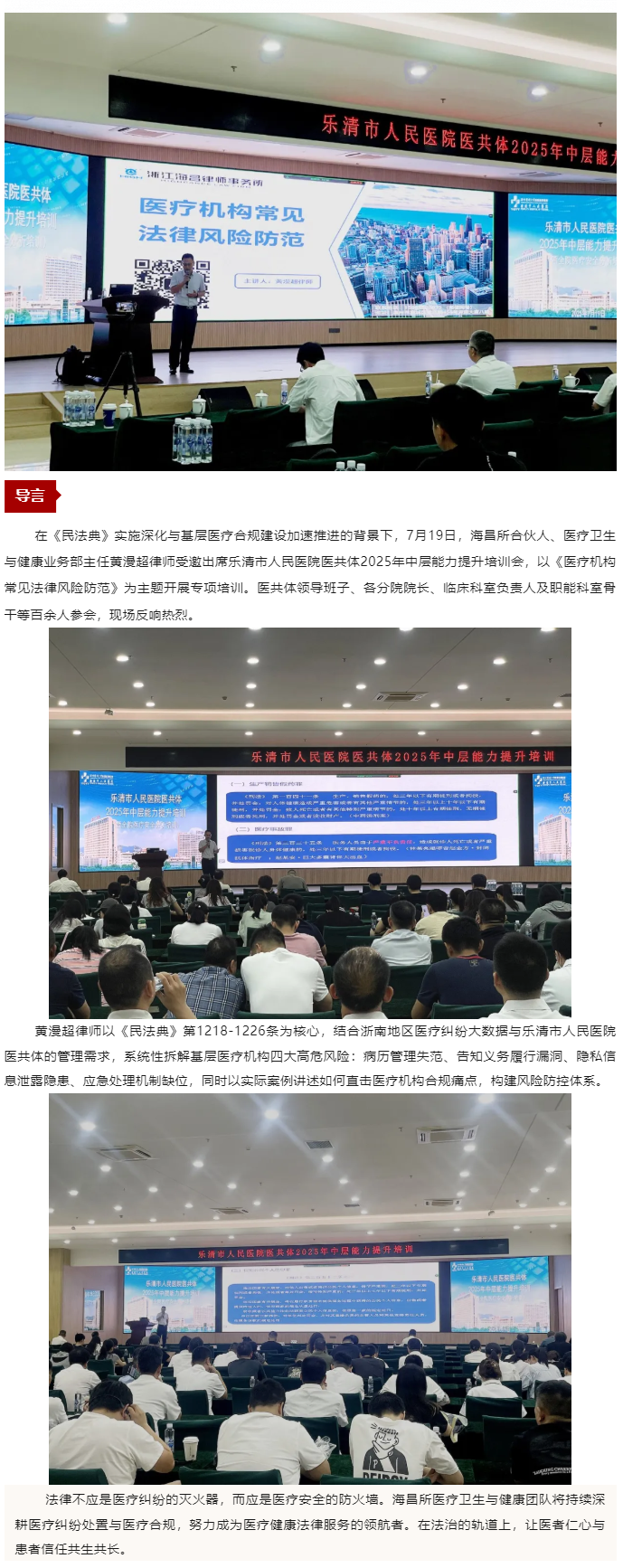 海昌所黄漫超律师受邀为乐清市人民医院医共体开展《医疗机构常见法律风险防范》专题培训