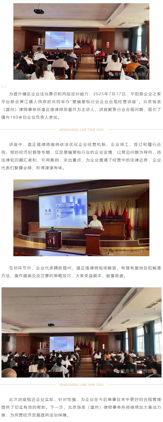 恒圣温州所温正搭律师受邀为萧江镇企业开展法治讲座