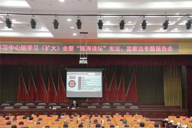 4月4日上午,瓯海区举办“瓯海讲坛”暨宪法修正案和监察法知识专题报告会。区委四套班子领导、区属有关单位主要负责人、普法联络员,各镇街(经济开发区)主要负责人及相关人员,区纪委(监委)机关工作人员、派驻纪检监察机构工作人员和区法学会会员共400余人参加报告会。