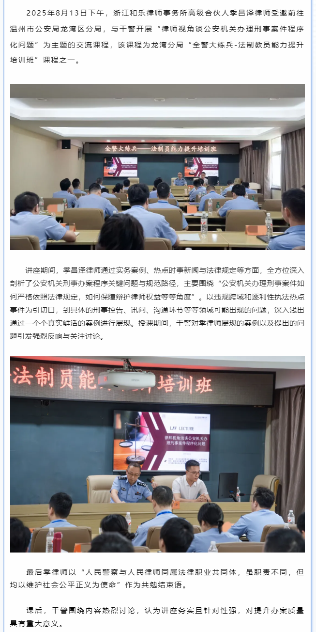 和乐所季昌泽律师受邀为温州市公安局龙湾区分局干警开展“律师视角谈公安机关办理刑事案件程序化问题”讲座