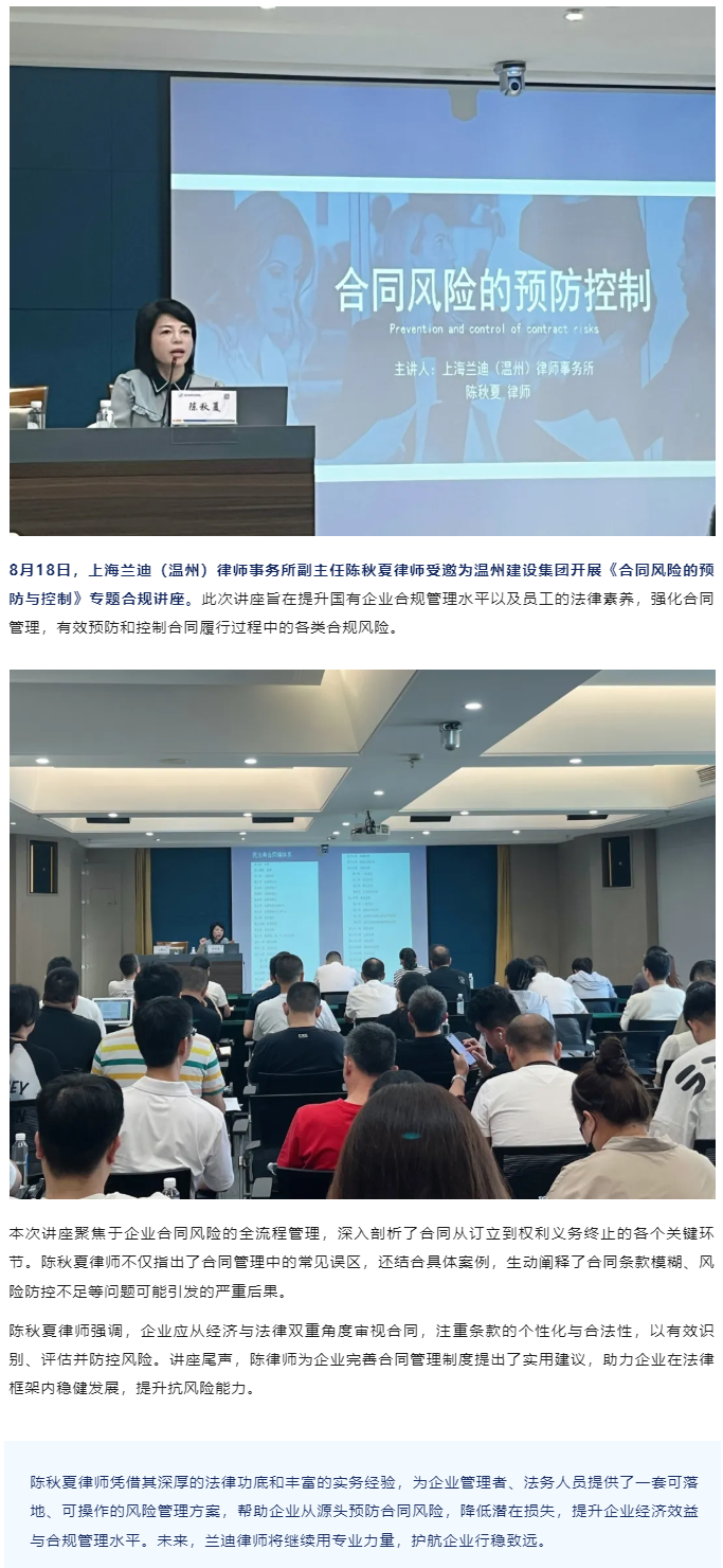 兰迪温州所陈秋夏律师受邀为温州建设集团开展《合同风险的预防与控制》专题讲座