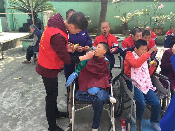 在我们到达时,托养中心已将有活动能力的残疾人集中坐在院子里。然后我们给每一位残疾人分发水果,与有说话能力的残疾人互相交谈。接着利用残托中心音响,与他们共同演唱《社会主义好》《学习雷锋好榜样》等革命歌曲。临近吃中饭,参与我们义工活动的龙湾区霞满天义工队的两个青年主动给不会自己吃饭的人喂饭。我们和他们之间的互动给残托中心带来欢乐和温暖,他们笑容满面,显得很开心。中心的院长和工作人员再三表示感激联英义工队多年来对他们的关爱和付出。