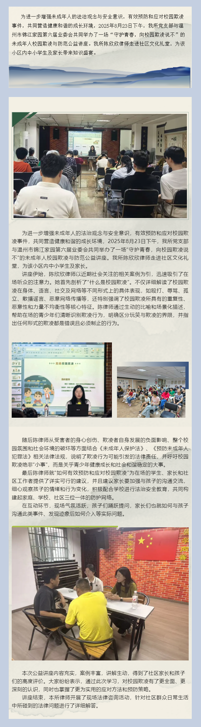 聚祺所陈欣欣律师受邀开展未成年人校园欺凌与防范公益讲座
