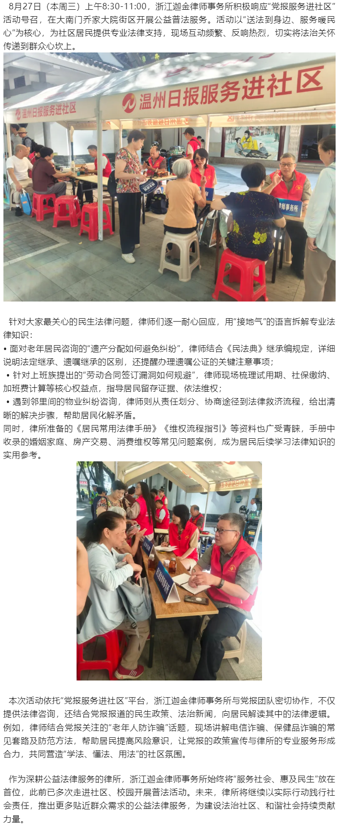 党报服务进社区,迦金普法办实事——浙江迦金律师事务所公益活动圆满举行