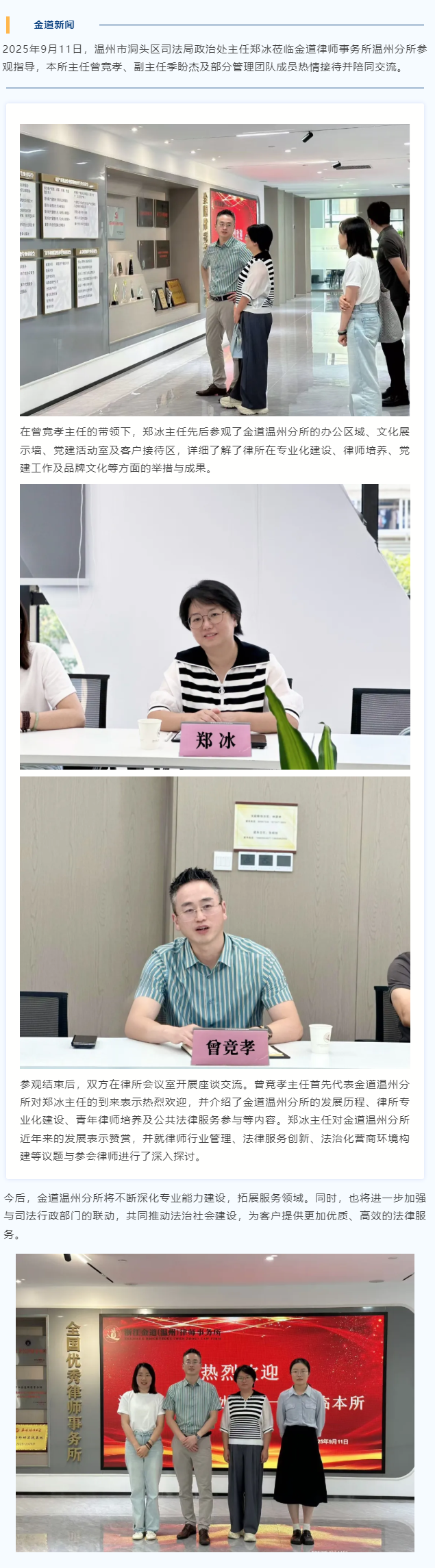 洞头区司法局政治处主任郑冰莅临金道温州分所参观指导