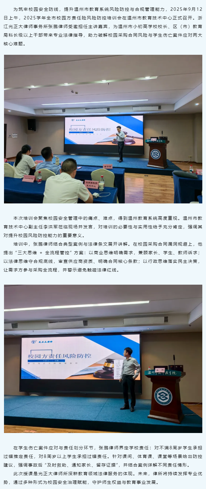 赋能校园安全治理|光正大所张鹏律师受邀开展2025学年温州市校园方责任险风险防控培训会