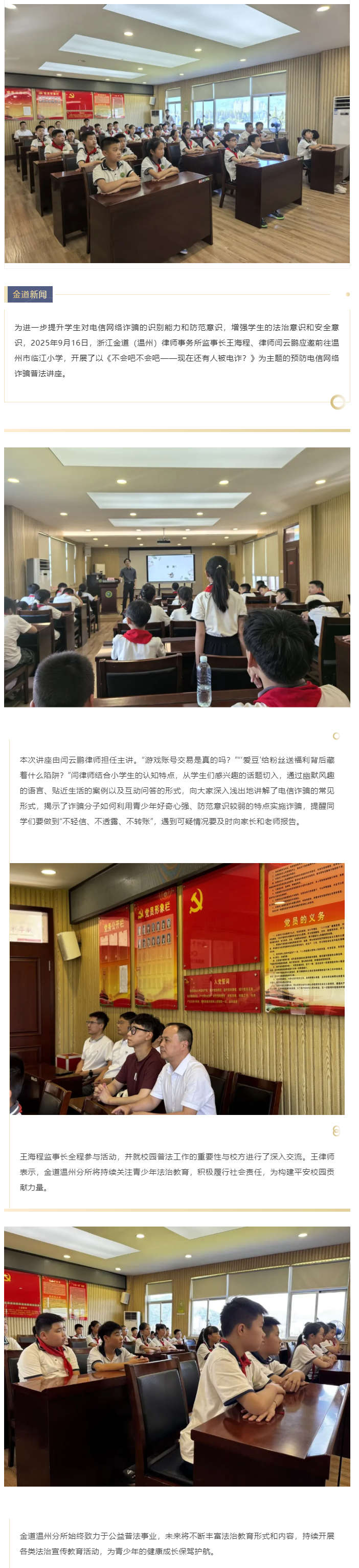 金道温州分所律师受邀前往温州市临江小学开展预防电信网络诈骗普法讲座
