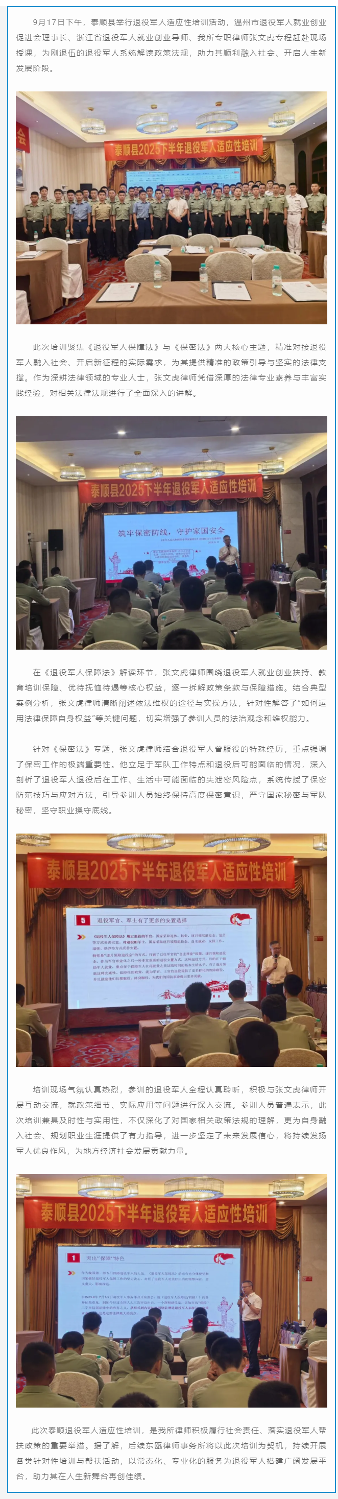 东瓯所张文虎律师受邀参加泰顺县退役军人适应性培训活动开展专题普法讲座