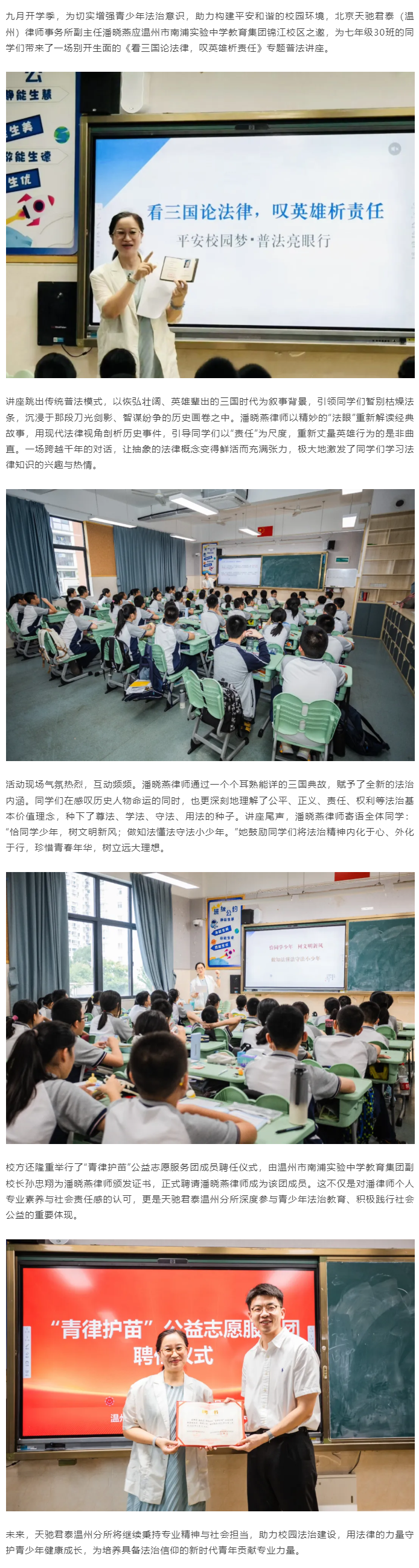 天驰君泰温州分所潘晓燕律师赴温州市南浦实验中学教育集团锦江校区开展普法讲座