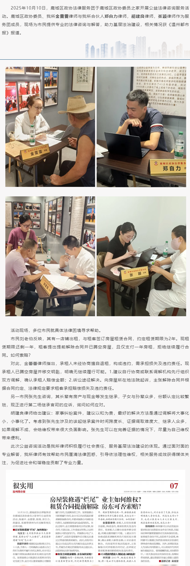 震瓯所律师公益法律咨询服务获《温州都市报》报道