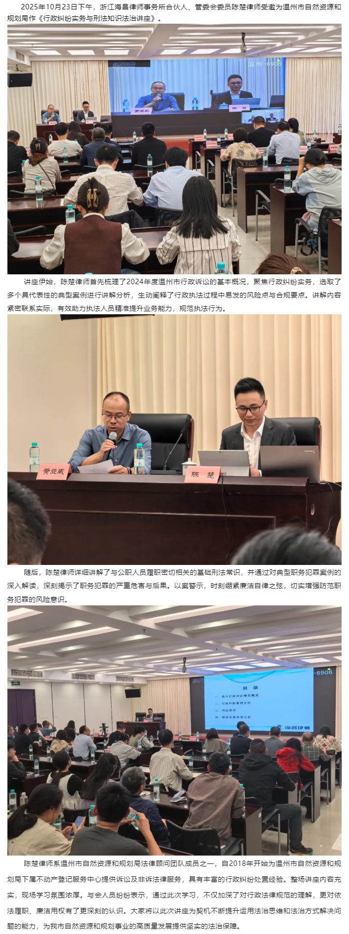 海昌所陈楚律师受邀为温州市自然资源和规划局作专题法治讲座