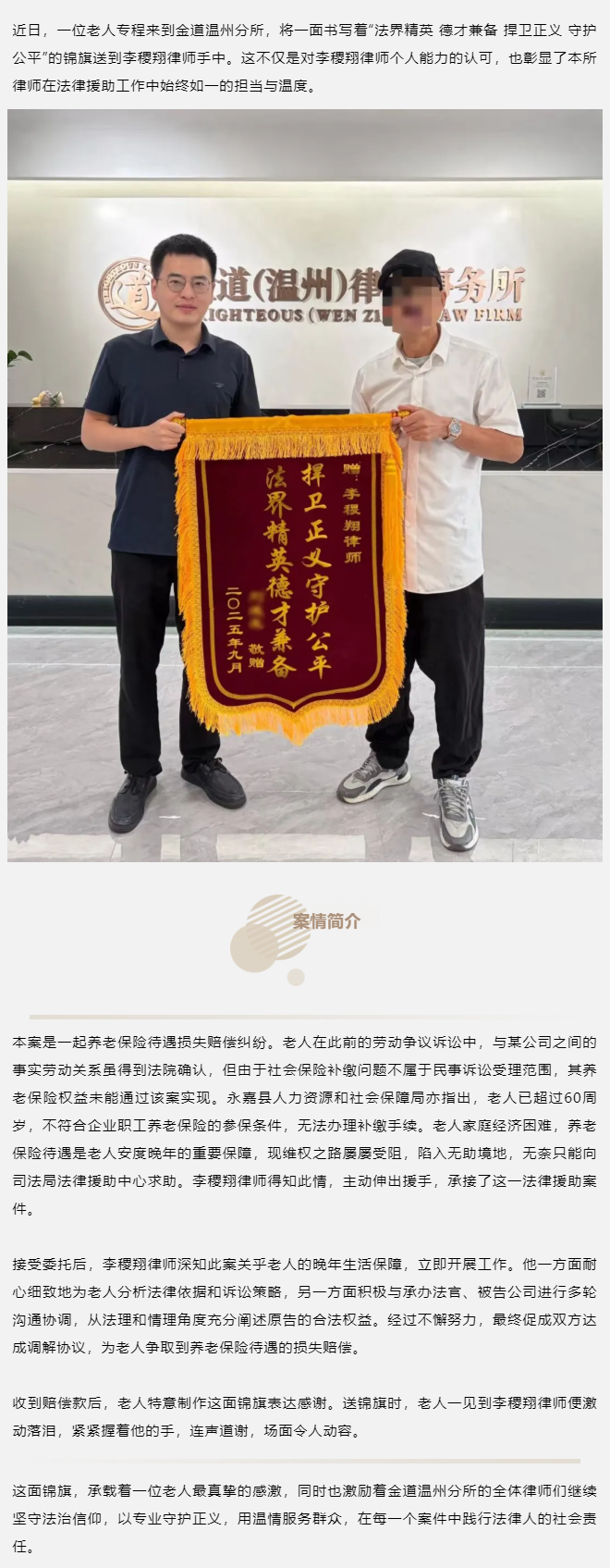 捍卫正义 守护公平 | 金道温州分所律师李稷翔获锦旗致谢