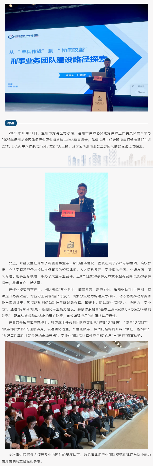 震瓯所执行主任叶锋虎律师受邀参加龙湾律师行业宣讲会 分享刑事团队建设路径