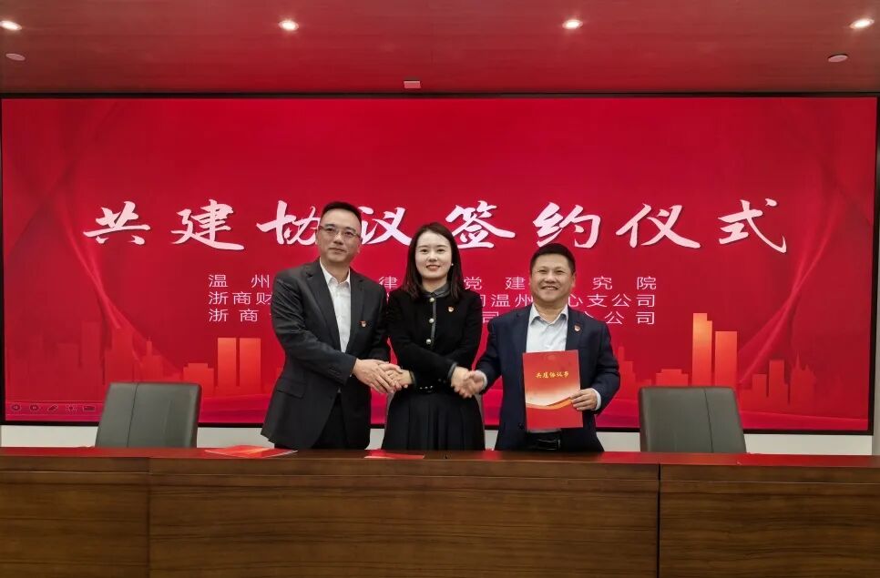 在共建协议签署环节,温州市瓯律红党建研究院理事长夏法沪,浙商财产保险股份有限公司温州中心支公司党支部书记、浙江分公司农险部负责人高原,浙商证券股份有限公司温州分公司党支部书记、总经理池大浩作为三方代表,共同签署了《共建协议书》,正式确立了党建联建合作关系。三方将本着“资源共享、优势互补、注重实效”的原则,在组织建设、专业服务、公益活动等方面开展协同合作,为未来的深度合作奠定了坚实基础。