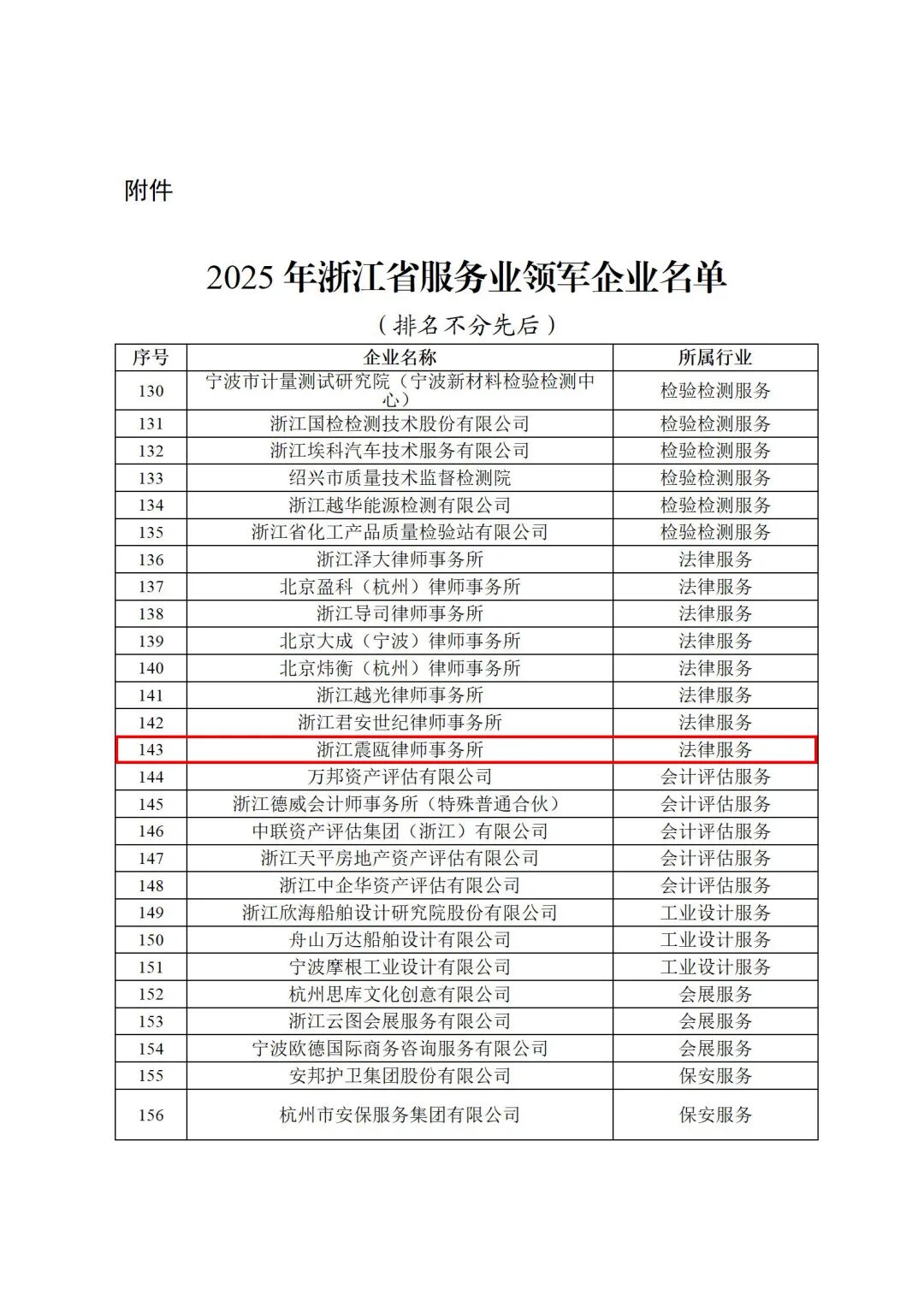 近日,浙江省发展和改革委员会正式公布《2025年浙江省服务业领军企业名单》,我所凭借在法律服务业领域的扎实专业积淀、持续创新服务能力及良好行业影响力成功入选,成为本次名单中温州地区唯一入选的律师事务所。