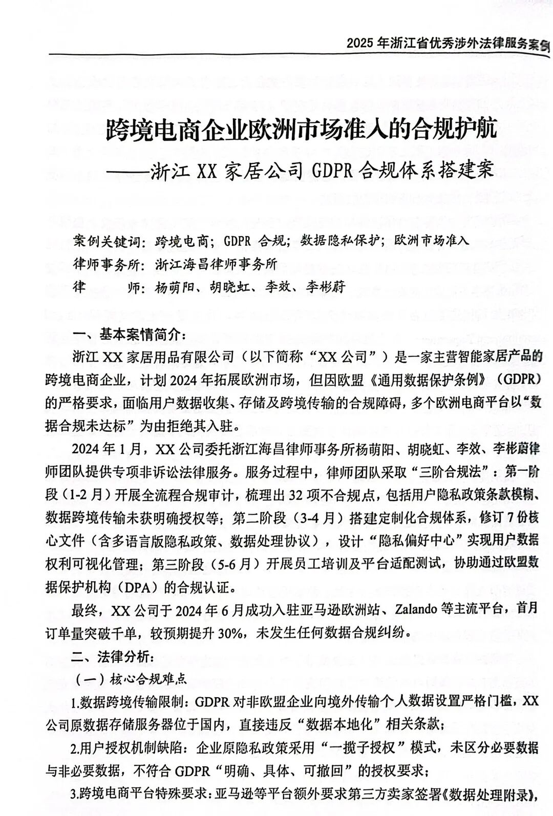 案例名称:《跨境电商企业欧洲市场准入的合规护航——浙江 XX 家居公司GDPR合规体系搭建案》案例关键词:跨境电商;GDPR 合规;数据隐私保护;欧洲市场准入