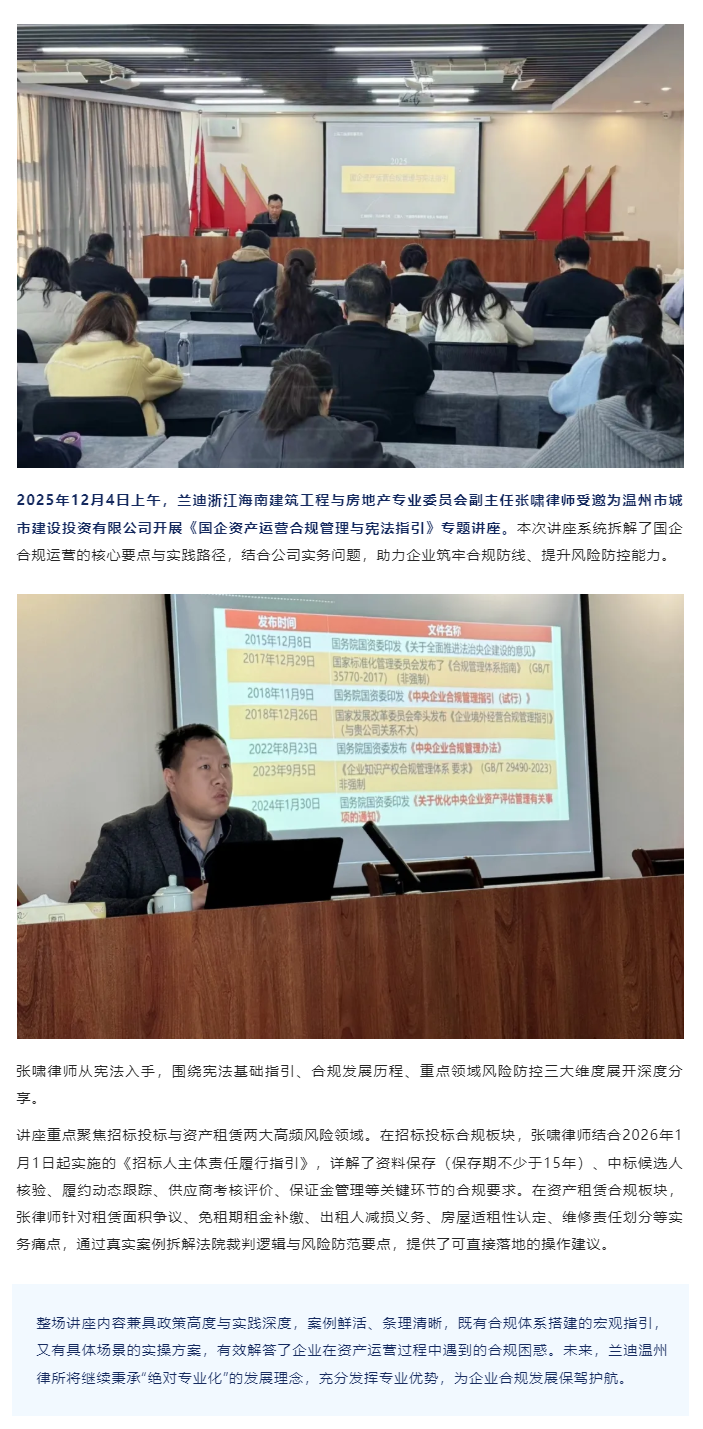 兰迪温州张啸律师受邀作《国企资产运营合规管理与宪法指引》专题讲座