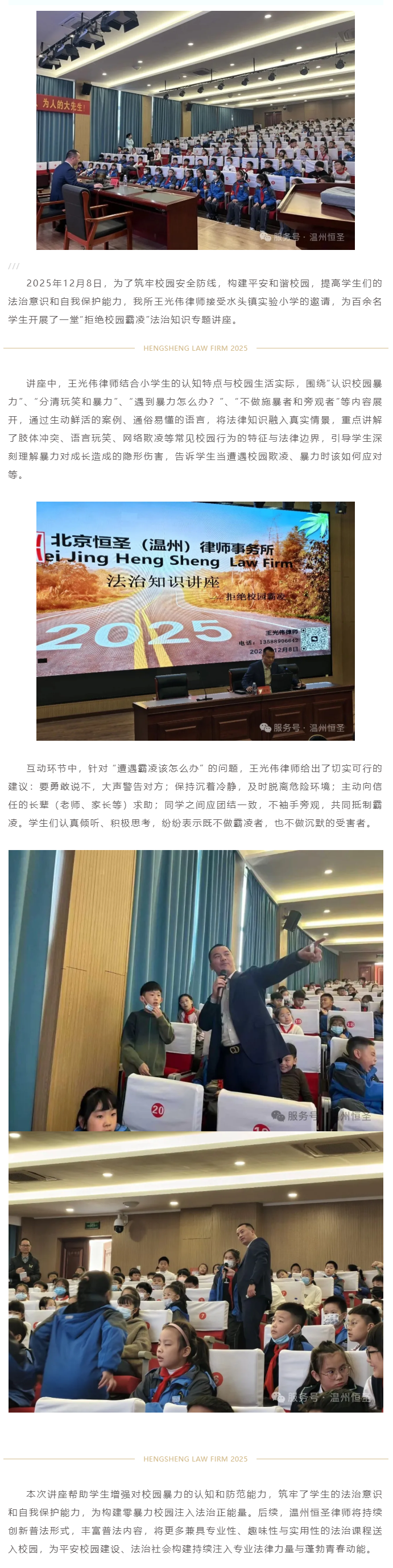 恒圣所王光伟律师受邀为水头镇实验小学开展“拒绝校园霸凌”法治知识专题讲座