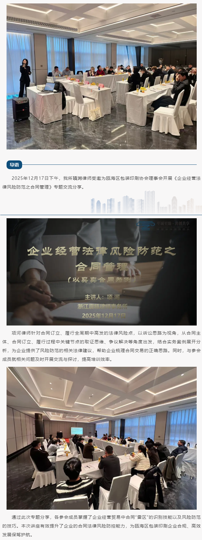 震瓯所项河律师受邀为瓯海区包装印刷协会开展“合同管理”专题分享
