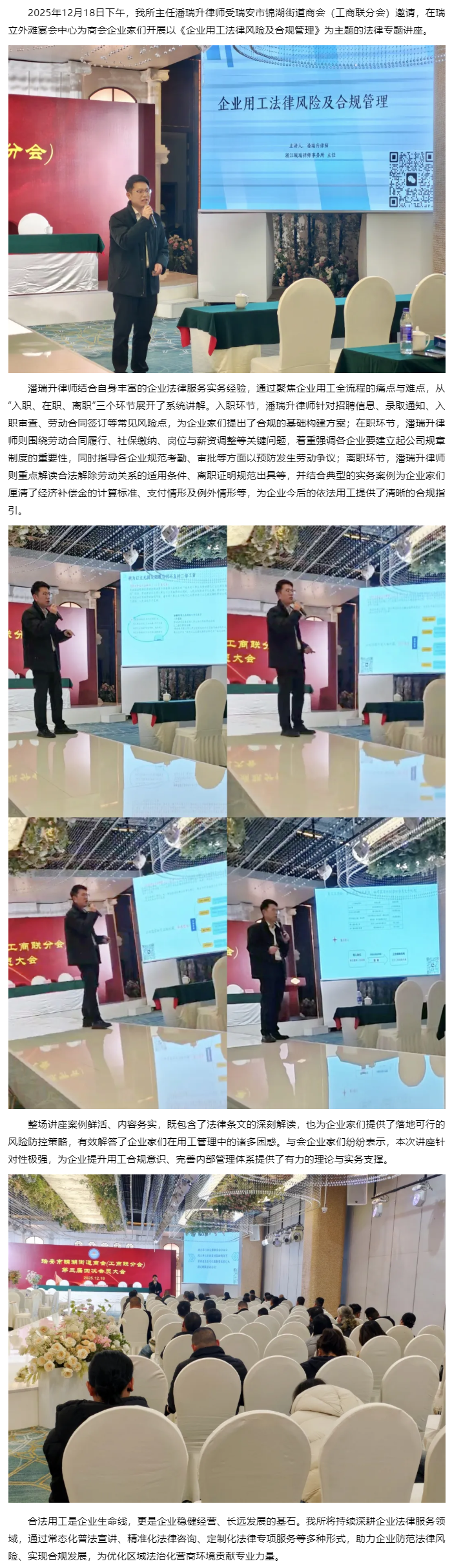 瓯瑞所潘瑞升主任受锦湖商会邀请开展《企业用工法律风险及合规管理》专题讲座