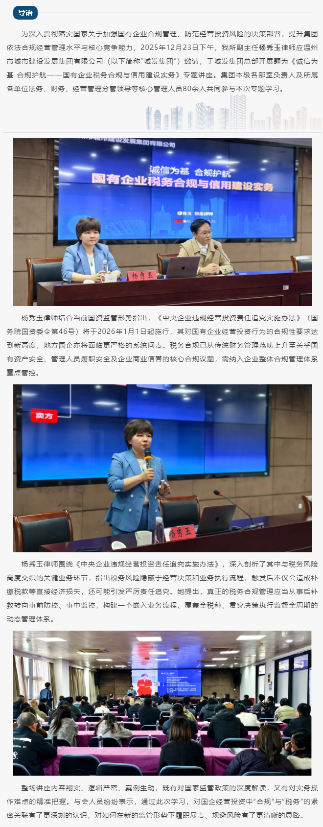 震瓯所副主任杨秀玉律师受邀开展国有企业税务合规与信用建设专题讲座