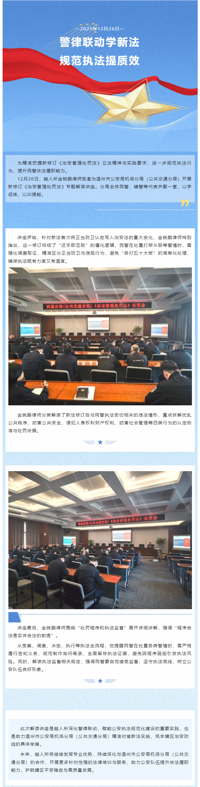 越人所金锐鹏律师为温州市公安局机场分局(公共交通分局)开展新修订《治安管理处罚法》专题解读讲座
