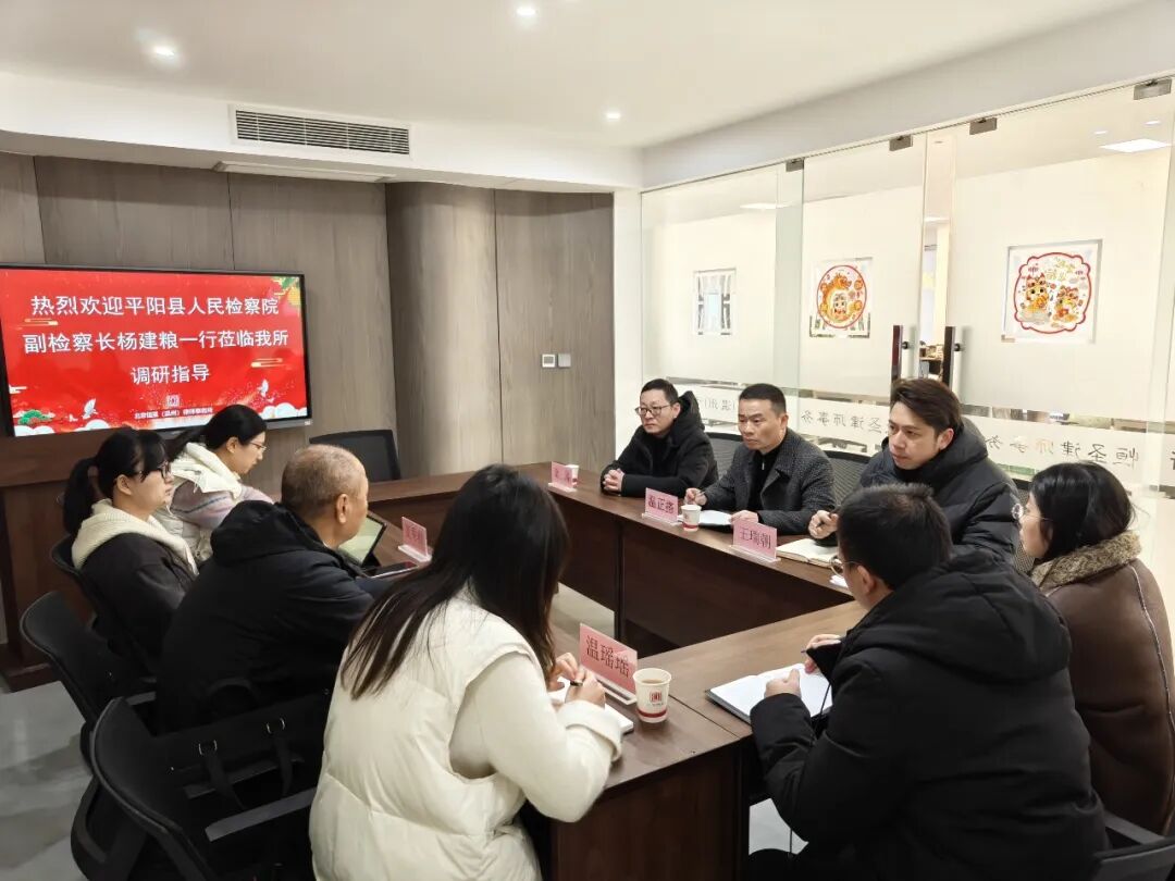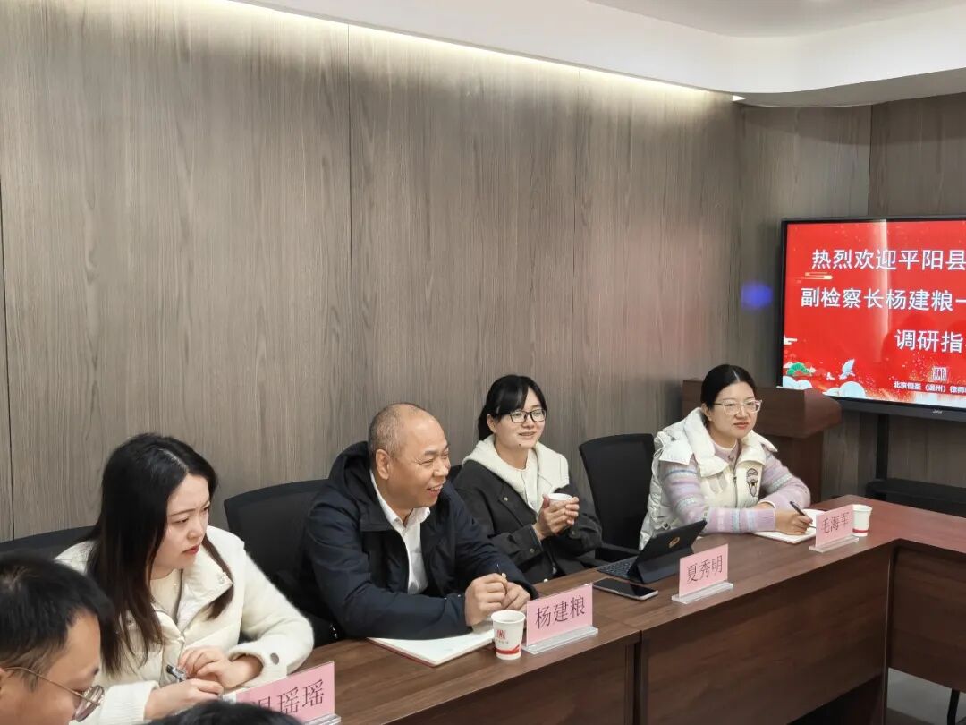 2026年1月8日上午,平阳县人民检察院副检察长杨建粮率队莅临北京恒圣(温州)律师事务所进行调研指导。我所温正搭律师、王瑞朝律师、金涛律师等人热情接待来访领导,并参与座谈会。