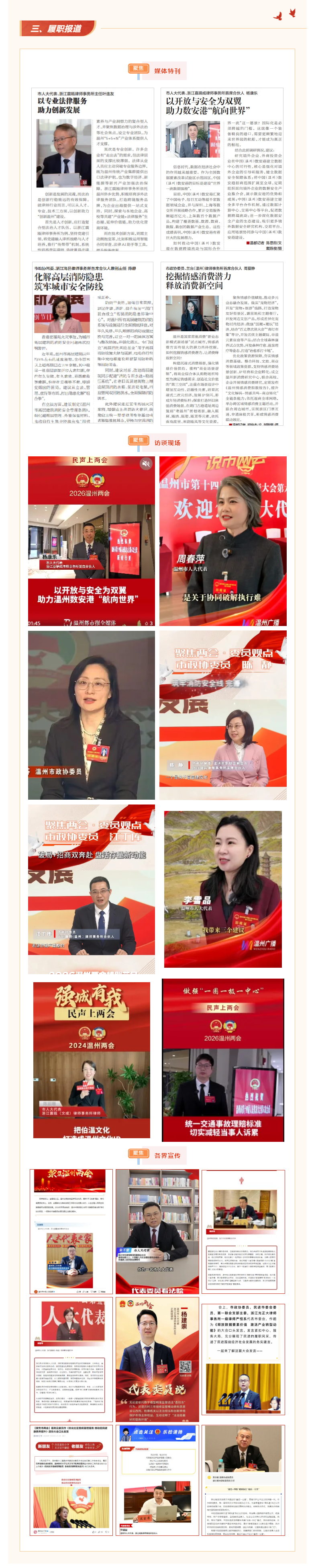 我市36名律师代表、委员们,紧扣温州纵深推进做强“一圈一极一中心”的奋斗目标,共提交议案、建议和提案74份,为“十五五”良好开局凝聚起合力,推动全市律师行业高质量发展迈上新的台阶。