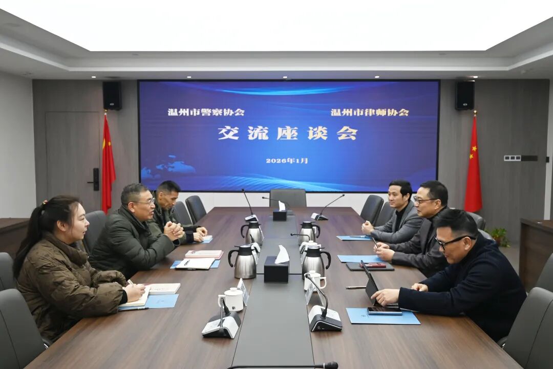 1月22日,温州市警察协会副会长、秘书长朱振华一行走访市律师协会,双方围绕深化警律协作开展交流。市律师协会会长金疆等参加座谈。
