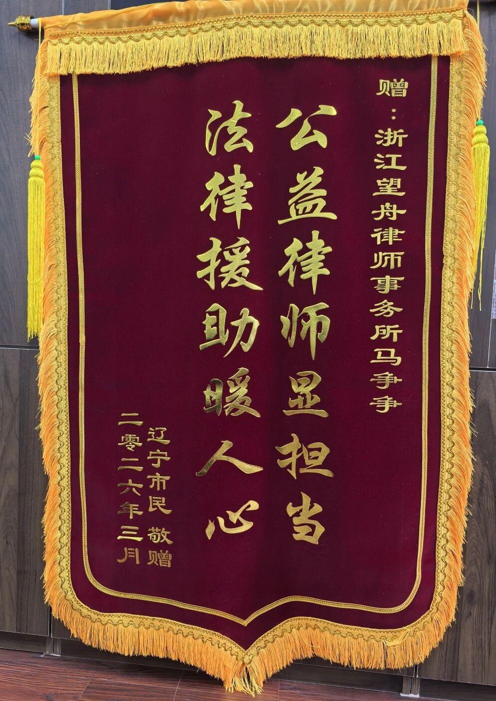 近日,浙江望舟律师事务所马争争律师获法援当事人赠予锦旗。锦旗上“公益律师显担当 法律援助暖人心”十四个金字熠熠生辉,充分彰显了当事人对马争争律师恪尽职守、专业尽责、用心办案的高度认可与诚挚谢意。