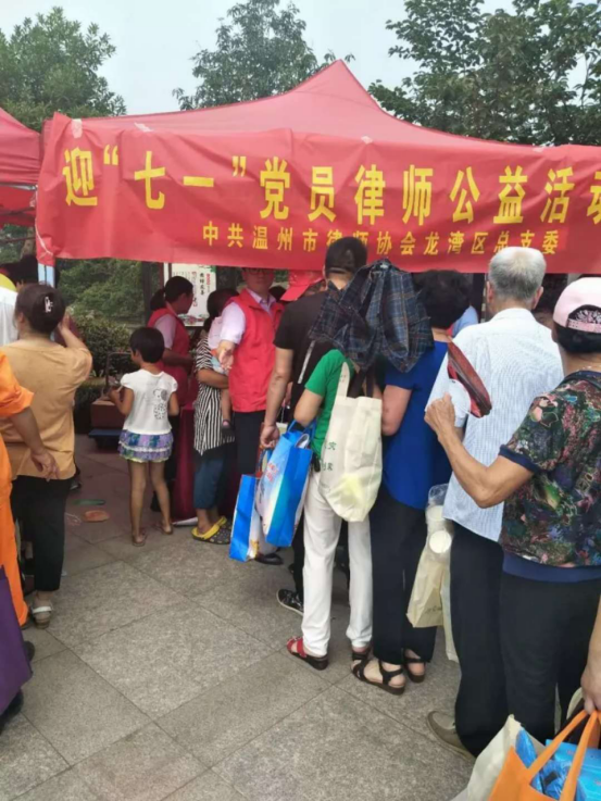 为纪念中国共产党成立97周年,深入贯彻落实党的十九大会议精神,6月28日,温州律师协会龙湾党总支、龙湾区司法局机关支部组成律师党员普法志愿队,联合开展“红七月 ‘党建·法治’携手筑梦服务月”、“迎‘七一’党员律师公益活动”为主题的党员志愿者服务活动。