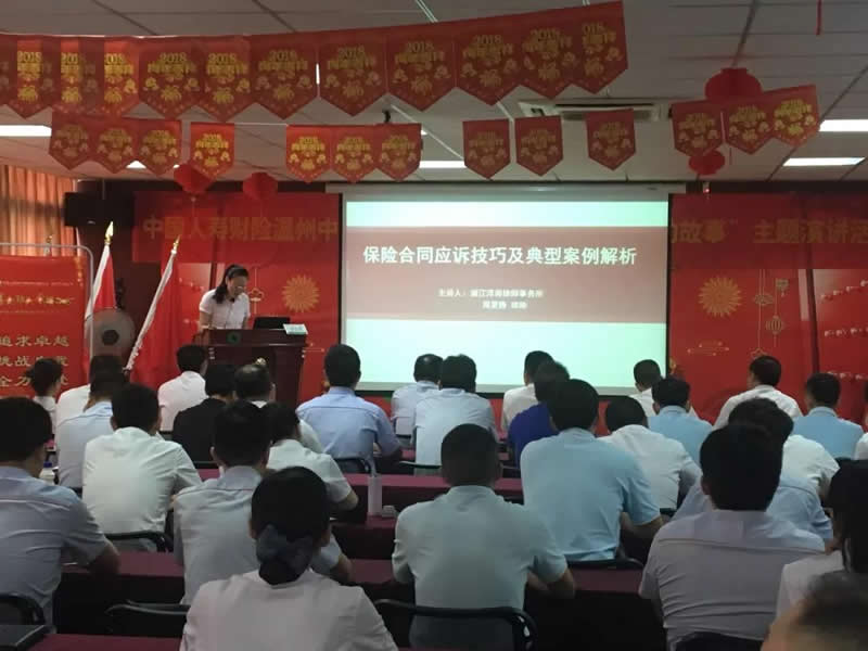 7月26日上午,浙江泽商律师事务所周夏静律师受邀为中国人寿财险股份有限公司温州中心支公司业务骨干员工作了以“保险合同应诉技巧及典型案例解析”为主题的讲座。国寿财险温州地区负责人黄益满副总经理以及其他相关领导、温州交警中队相关领导、国寿财险各部门业务骨干出席此次讲座。