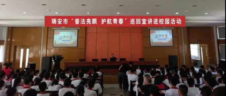 瑞安市“普法亮眼 护航青春”巡回宣讲进校园活动是由瑞安市司法局联合瑞安团市委、瑞安市教育局共同举办,组建一支由17位专业青年律师组成的“普法亮眼 护航青春”巡回宣讲团,首轮巡回宣讲于9月14日至10月19日在瑞安市27所中小学校开展。活动旨在通过巡回讲座的形式,预防和减少校园欺凌和暴力,提升教师、家长、学生的法律素养,维护青少年学生合法权利,促进青少年健康成长。