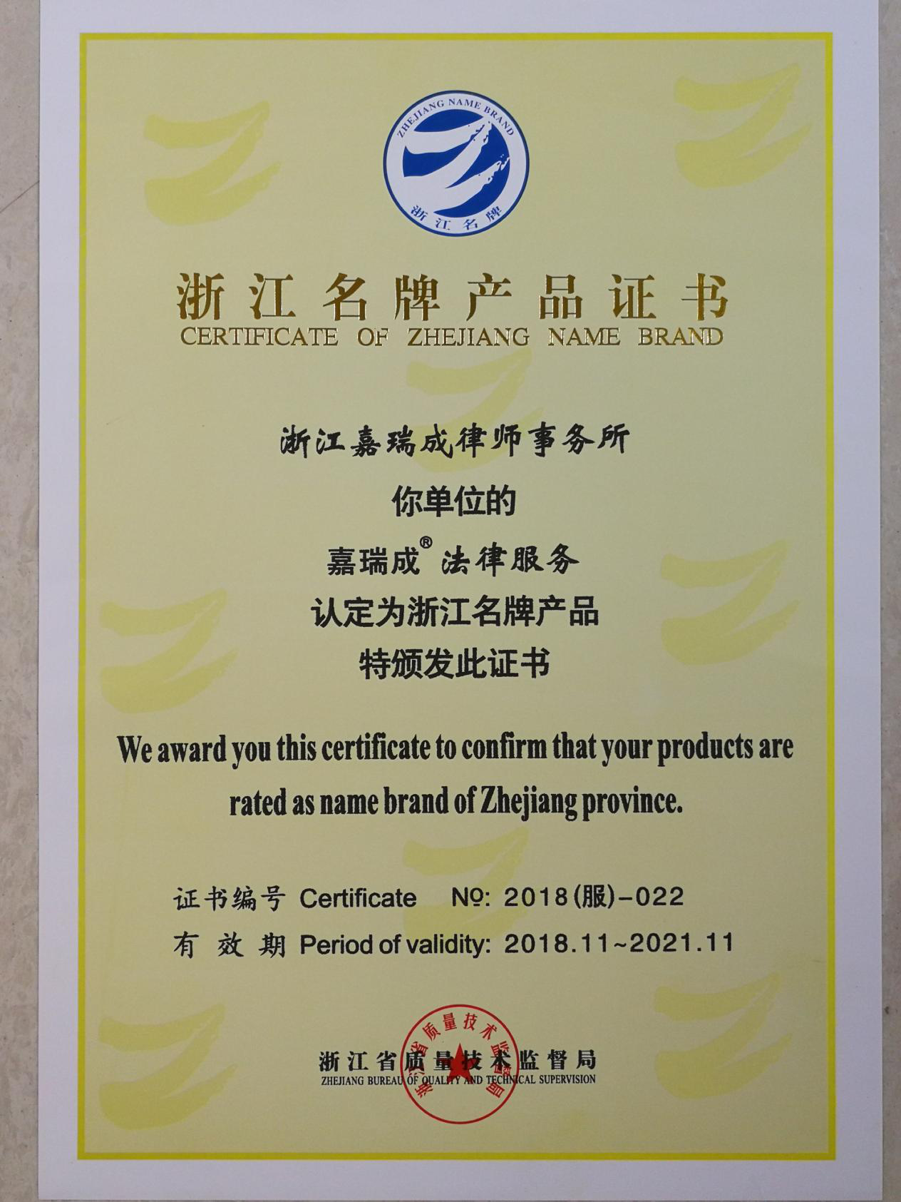 新年伊始,喜事上门!近日,由浙江省质量技术监督局授权、浙江省名牌战略推进委员会评选的“浙江名牌产品”名单隆重揭晓,浙江嘉瑞成律师事务所申报的“嘉瑞成法律服务”被认定为“浙江名牌产品”。