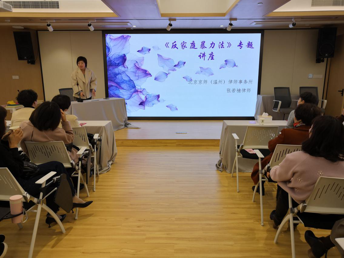 在“三八”国际妇女节来临之际,龙湾区司法局瑶溪司法所开展以“反家暴”为主题的法律知识讲座。邀请北京京师律师事务所张若楠律师为广大女性同志宣讲“反家暴”的相关法律知识。在讲座现场,张律师详细地介绍了家暴的定义、遇到家暴时可采取的措施及《反家庭暴力法》的相关内容。