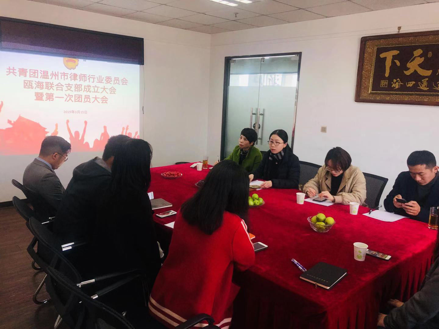 2019年3月15日,共青团瓯海区律师行业联合支部成立大会暨第一次团员大会隆重召开。会议由共青团温州市律师行业委员会副书记彭伊妮主持,瓯海区司法局法管科科长董素飞、浙江浙合律师事务所副主任胡忠高及7名团员共同出席会议。
