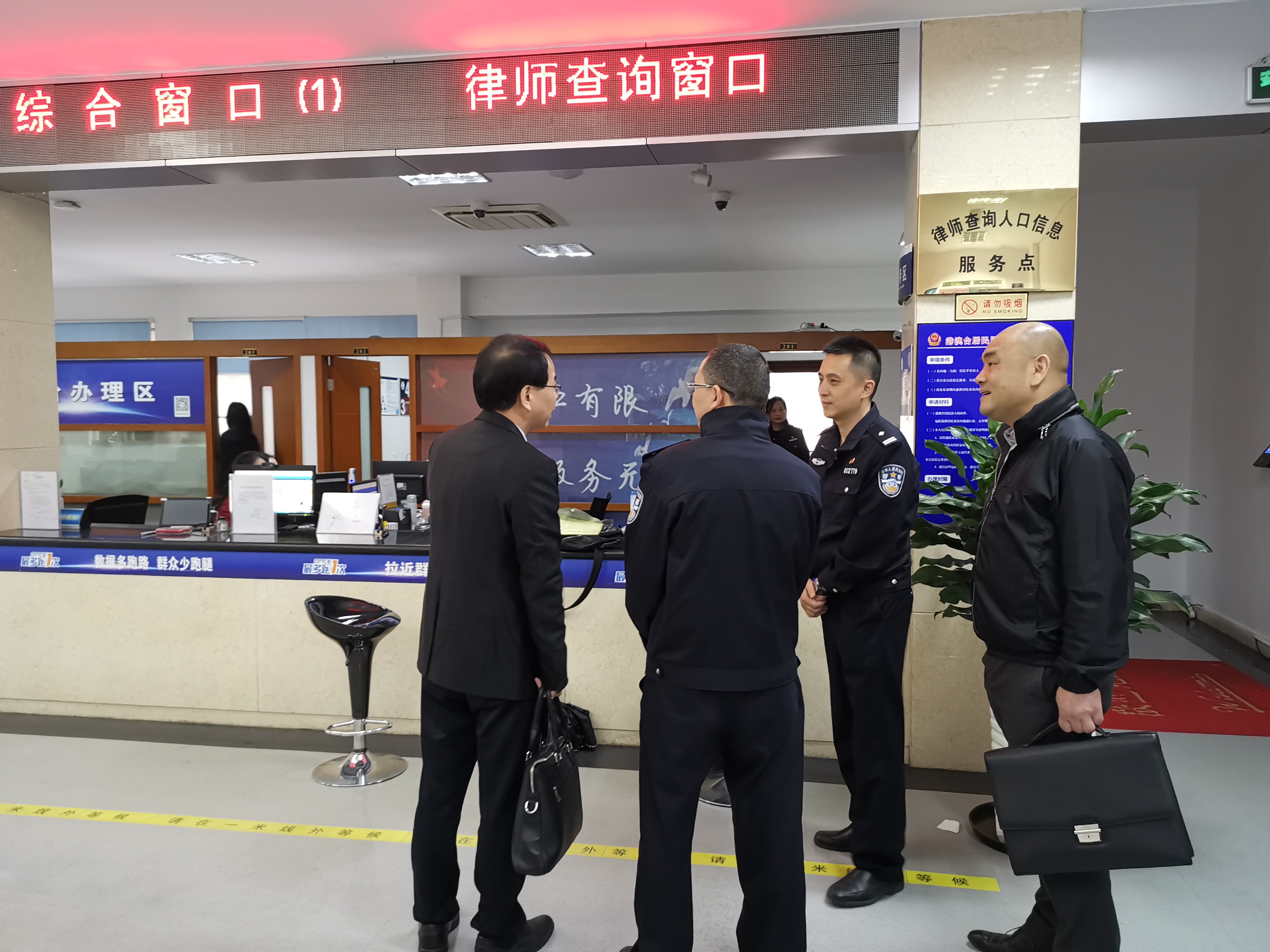 4月10日,市律师协会叶连友会长携郑海副会长、孙晓宁副秘书长一行赴鹿城区行政审批中心公安分局律师查询窗口慰问,并进行座谈交流。双方就如何保障律师执业权益、建立“警律”良性互动渠道等问题进行探讨。分局行政审批科负责人就律师查询业务的操作流程、申请规范等工作和存在问题进行介绍。