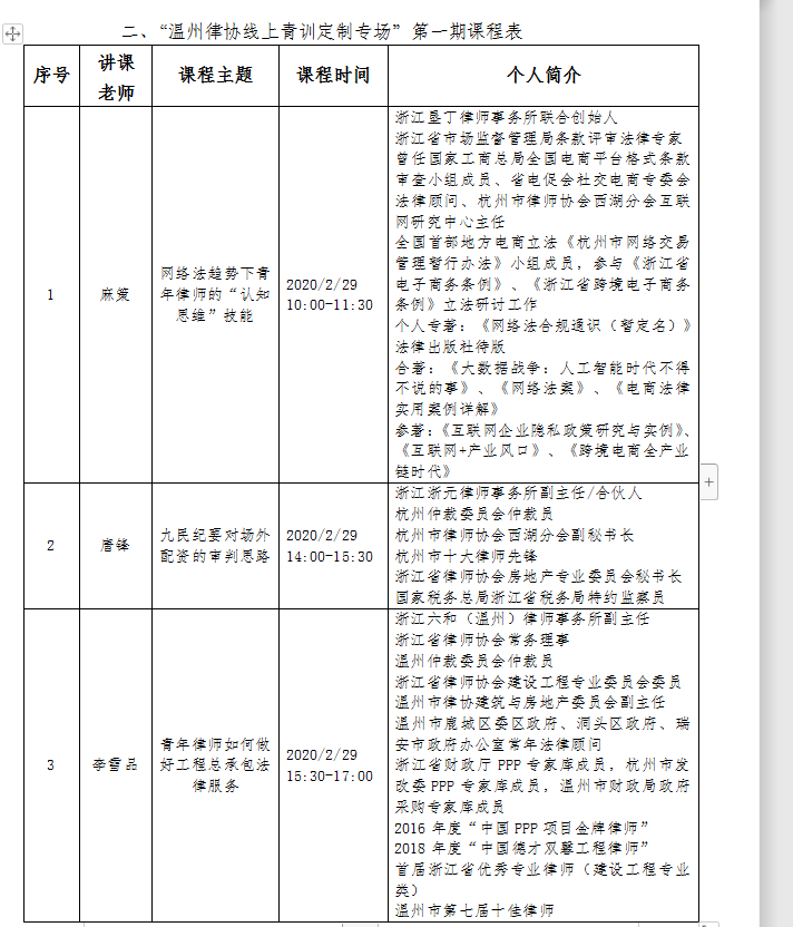 二、“温州律协线上青训定制专场”第一期课程表